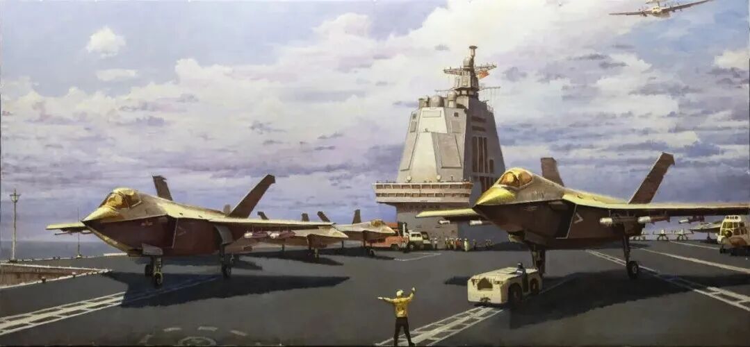 油画《箭上弦》,作者周补田。福建舰作为我国首艘选用电磁弹射技能的航母,标志着水兵配备科技迈入全新阶段。歼35作为新一代舰载战斗机,从列装到露脸九三阅兵,成为我国国防实力的生动注脚。经过画笔,“科技强军”的抽象概念转化为具象画面,而且不再是传统军事体裁中单一的兵器展示,而是聚集歼35在福建舰上“预备弹射”这一动态瞬间如箭在弦,任务必达。