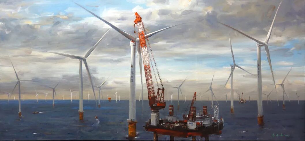 油画《惠来海优势电》,作者冯少协。“海优势电走廊”点亮万亿绿能、海洋草场才智饲养渠道矗立海面“海上新广东”美丽画卷正缓缓铺展。作者将实在见识诉诸笔端,以丰满的热情和开阔的构图,描绘了碧海蓝天间风电机组的雄伟矩阵。著作中,天空与海面构成安静却充溢张力的场域,工业力气与诗意图景相融,绘就清洁动力开展新篇章。