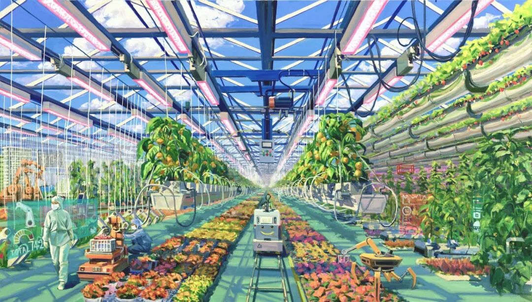 油画《智能农业园》,作者袁元、张子欣。在科技驱动下,才智农业开展迈上新台阶。著作聚集智能温室农业生产场景,重在体现物联网监控体系等对传统农业的改造。画面以写实的笔触、开阔的构图和亮堂的颜色,营建出满满的科技感;现代设备的几许化结构与农作物的天然曲线相映成趣,工业美学与田园诗意融为一体,铺展田园村歌新画卷。