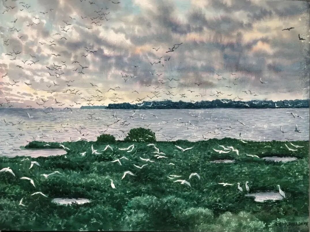 水彩画《湛江红树林湿地风景》,作者陈树中。“十四五”时期,广东湛江聚力打造“红树林之城”。现在,湛江红树林湿地不只是净化海洋的“海上森林”,更是鸟的天堂、生物多样性宝库,被誉为“国际湿地生态康复成功典范”。著作以此为着眼点,经过水天一色的空间布局和细腻的光影描写,描绘了一幅雄壮美丽的生态画卷。生气勃勃的红树林与波光粼粼的海面相辉映,在霞光中翩跹起舞的成群鹭鸟,不只展示了生命的律动,更是对人与天然调和共生理念的生动诠释。