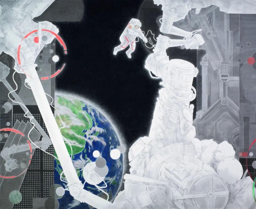 我国画《出舱》,作者杨斌。“十四五”以来,我国载人航天技能向着更高层次不断跨过。著作描绘了翟志刚、王亚平、叶光富3名航天员,在神舟十三号载人飞船与空间站组合体完结自主快速交会对接后,乘组履行第一次出舱活动的场景。作者以墨色的浓淡烘托以及物象的几许形状构成,营建出科技美感和浓浓诗意;是非的激烈比照进一步凸显世界的浩渺深邃,为读者留下无限幻想空间。