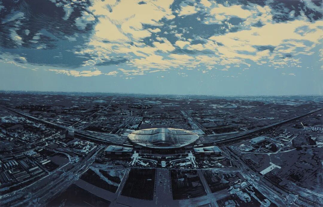 版画《雄安的拂晓》,作者王芳。从“一块地”到“一张图”再到“一座城”,八载岁月,河北雄安新区拔节成长、一日千里。著作以俯视式构图,打开一幅雄壮图景。画面上,写实的雄安站巍然屹立,坐落视觉中心;畅通无阻的路网和各功用区交错,配以沉稳的颜色和光线的奇妙运用,显示这座城市灿烂的未来。