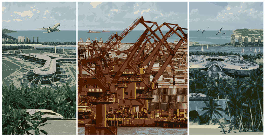 版画《海南自贸港》,作者孔国桥、鲁利锋、王克景。南海之滨,变革潮涌。5年来,海南自贸港加快建造开展,步入成形起势新阶段。著作以绝版套色木刻和三联画方法,描写了自贸港宏阔的场景,经过冷暖颜色的运用着意杰出机场、港口、基建等主体,在跨时空描绘中多角度展示海南自贸港昌盛的现象和繁荣的生机,奏响敞开开展的年代乐章。