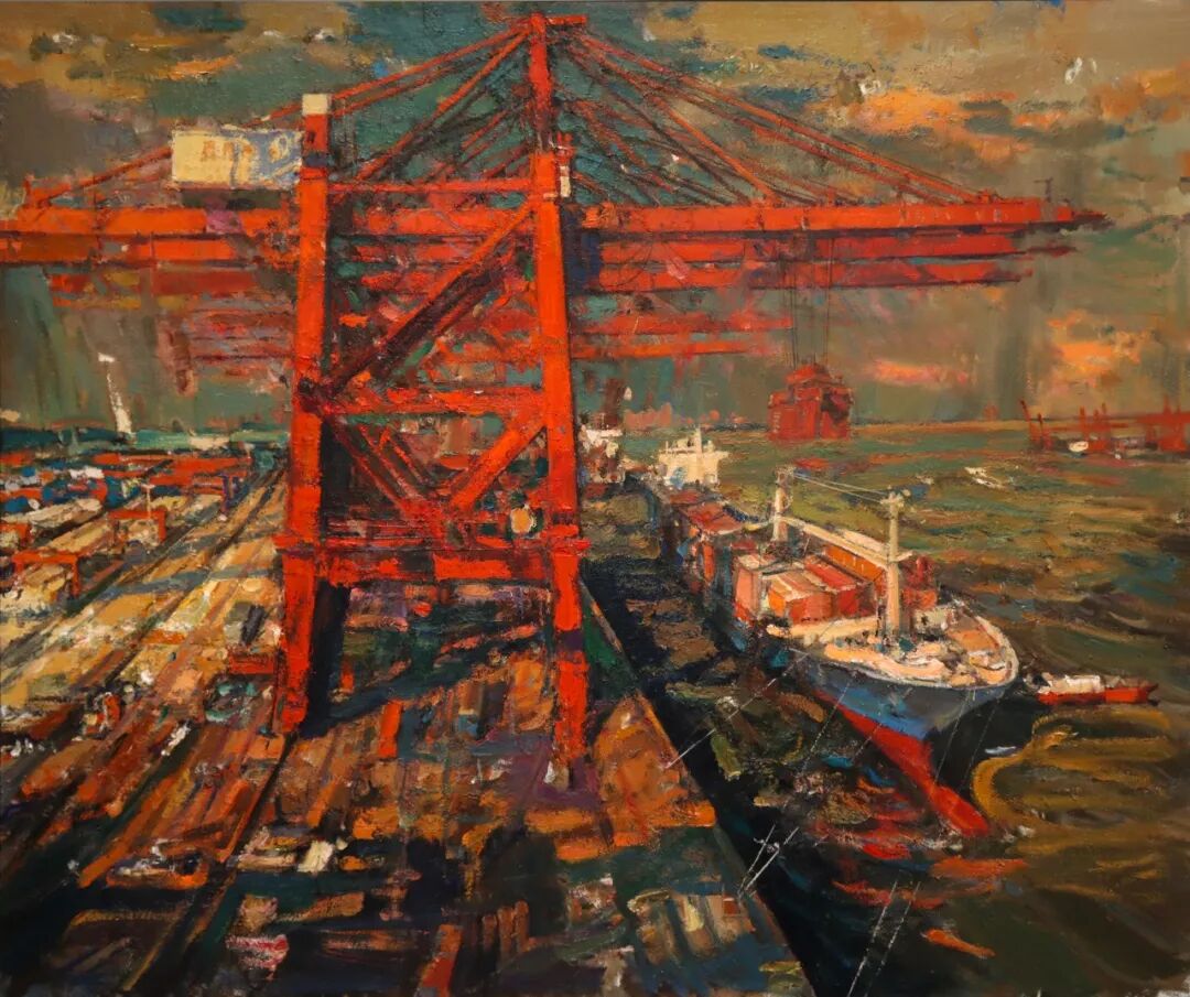 油画《扬帆起帆海丝起点之厦门港码头》,作者刘玉龙。东海之滨,海丝古港厦门港正全力改变开展方法与经济转型,不断续写传奇。著作撷取港口码头一景,以厚重的笔触描写了树立的起重机和络绎的船舶等,折射出21世纪海上丝绸之路重要节点的繁忙现象与澎湃气候。