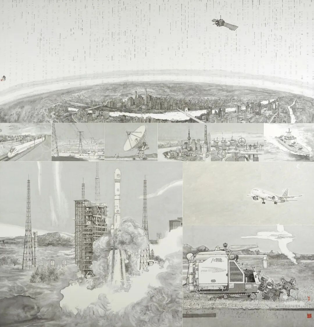 我国画《国之重器斗极》,作者宋德志。作者经过精心重组主题元素,使海陆空现象奇妙交错,出现了斗极在动力交通、农业生产、城市建造等范畴的广泛运用,生动诠释斗极使用不断深度融入国民经济开展大局。素雅的翰墨处理赋予画面轻灵之美,意在表达斗极卫星导航体系那种看不见的支撑力气。