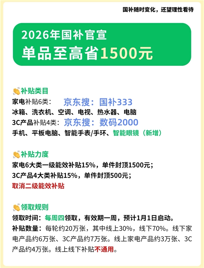 2026年国补调整核心思路清晰,将从“全方面覆盖”转向“精准滴灌”,各领域调整细则如下: